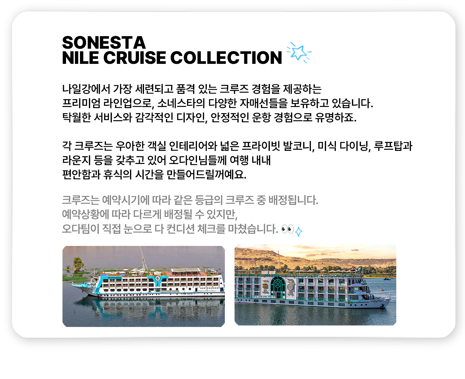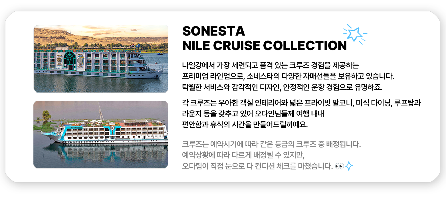 5성급 나일강 크루즈로 핵심 신전들 투어도 챙겨야죠.