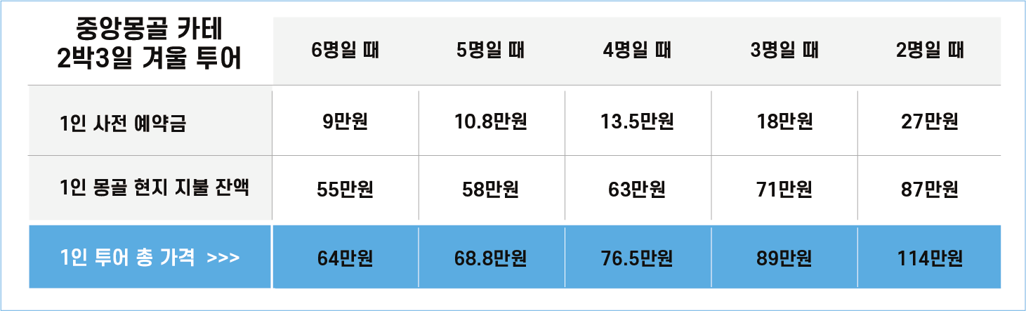 - 예약금을 제외한 잔액은 몽골에 도착한 후 자야트래블에게 투어 시작 전 한화로 지불하면 됩니다.(달러도 물론 가능!)