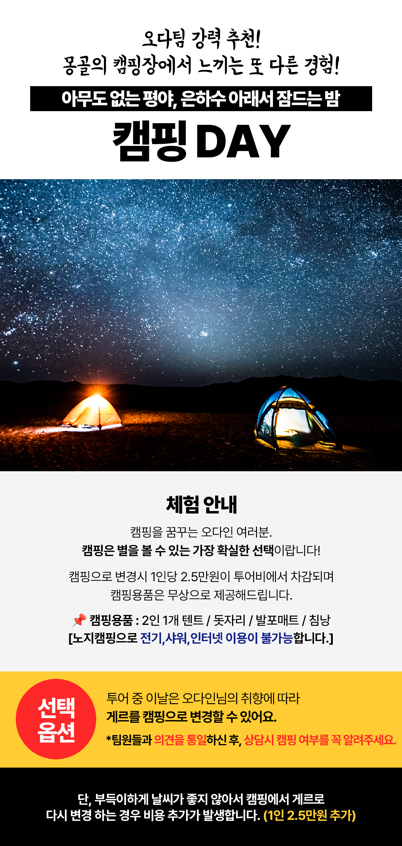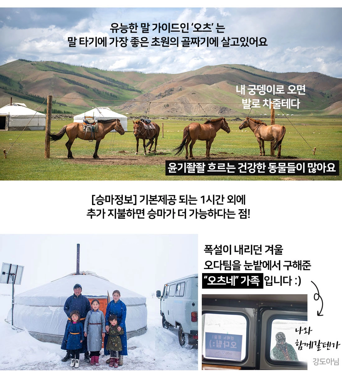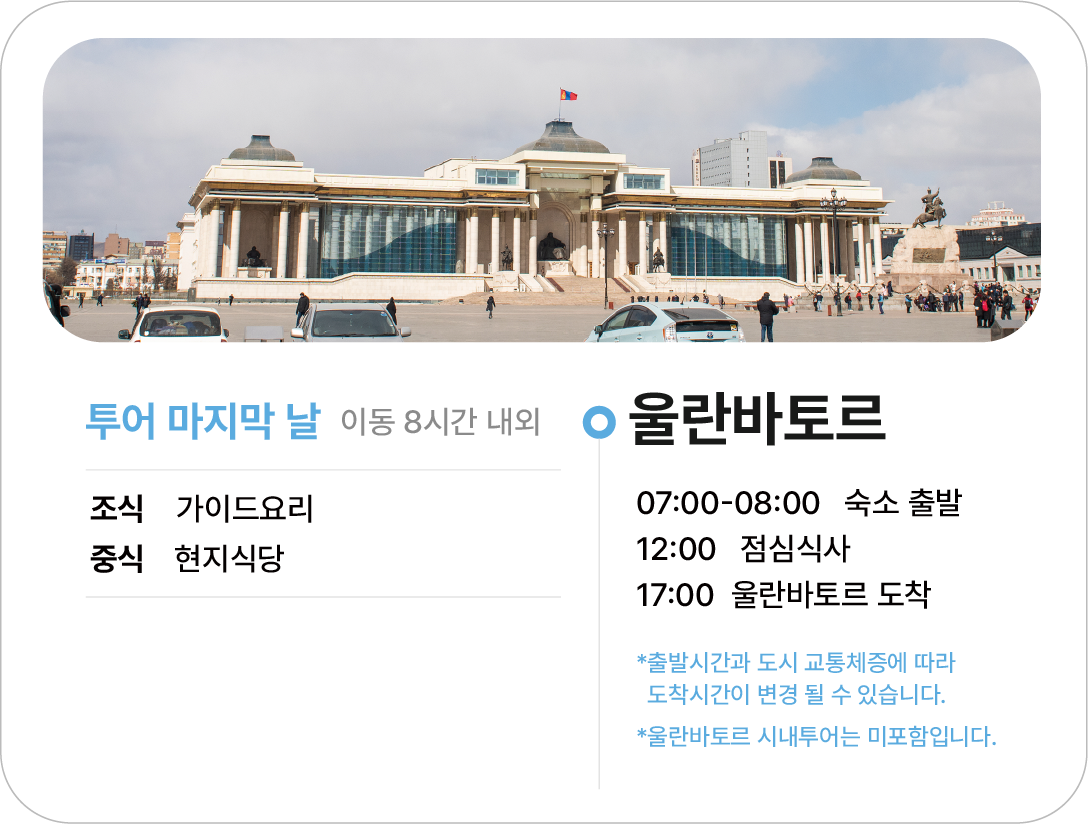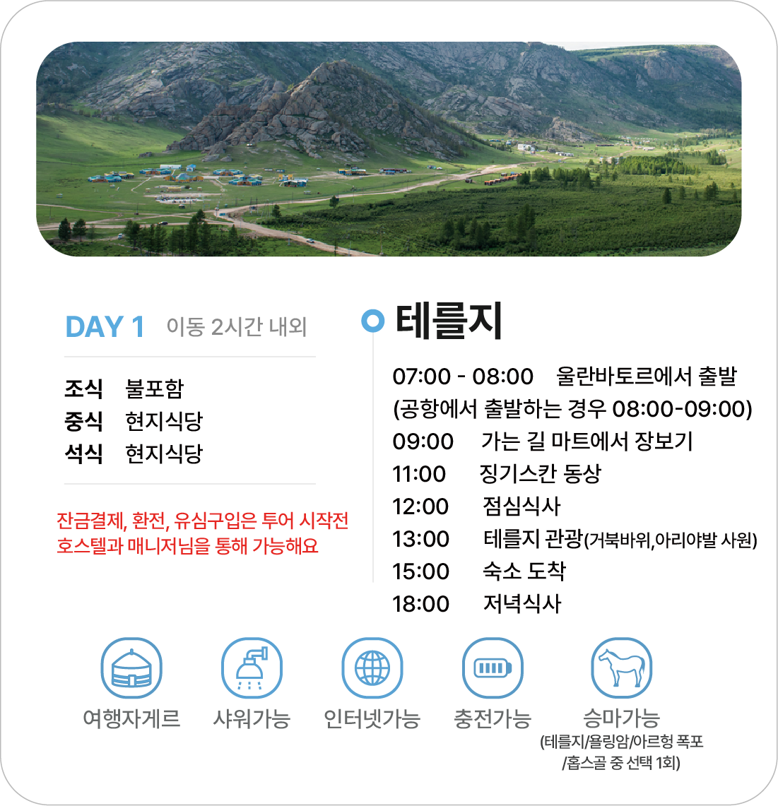 - 예약금을 제외한 잔액은 몽골에 도착한 후 자야트래블에게 투어 시작 전 한화로 지불하면 됩니다.(달러도 물론 가능!)