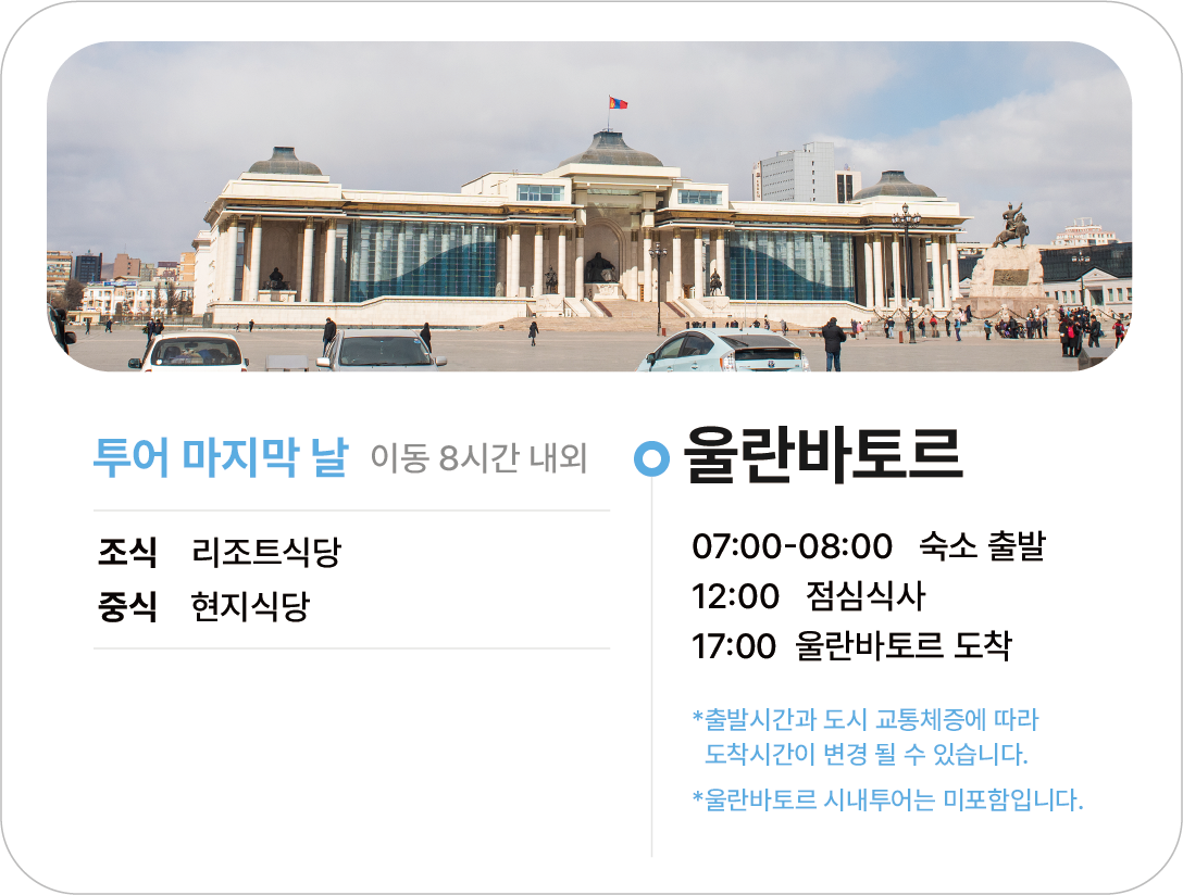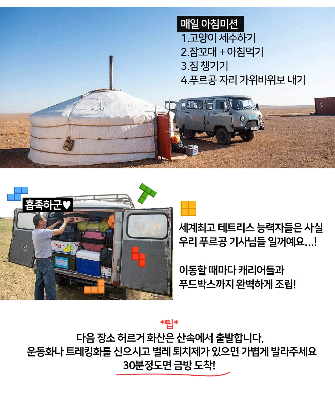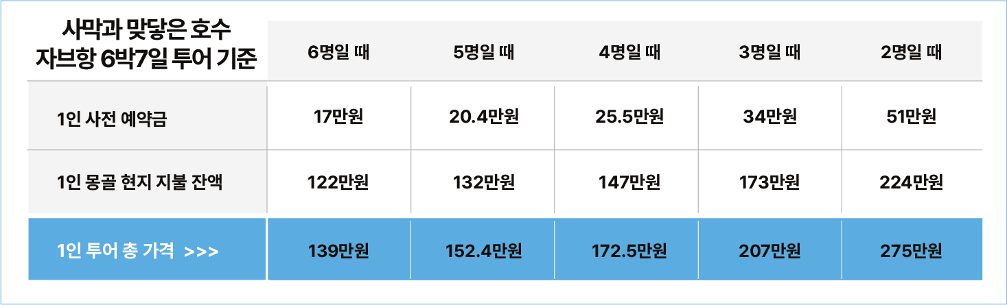 - 예약금을 제외한 잔액은 몽골에 도착한 후 자야트래블에게 투어 시작 전 한화로 지불하면 됩니다.(달러도 물론 가능!)