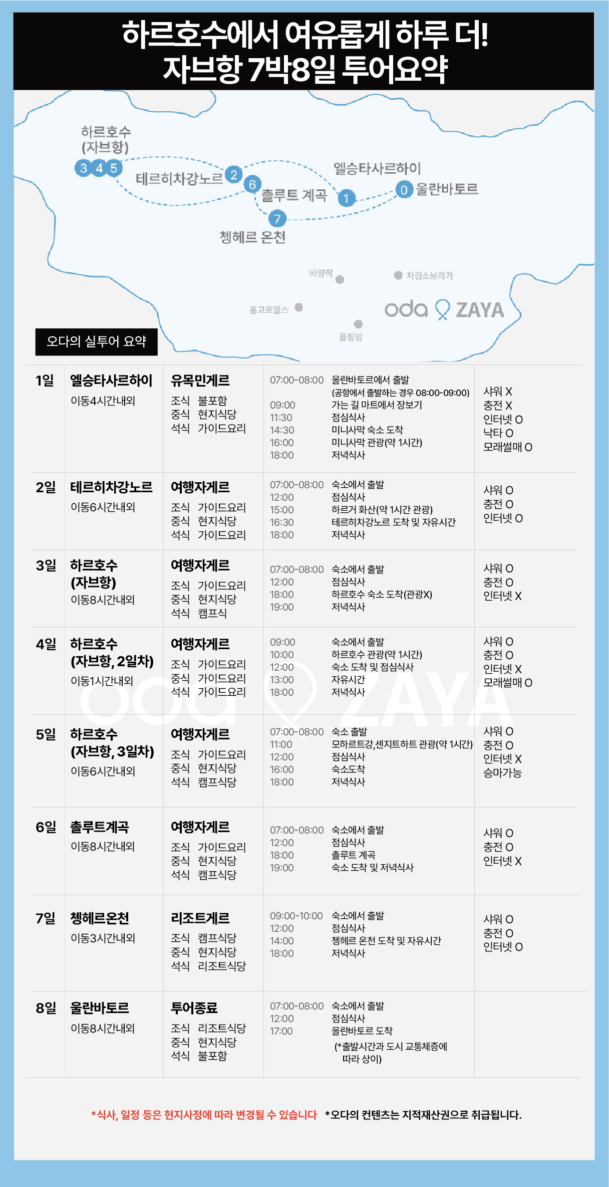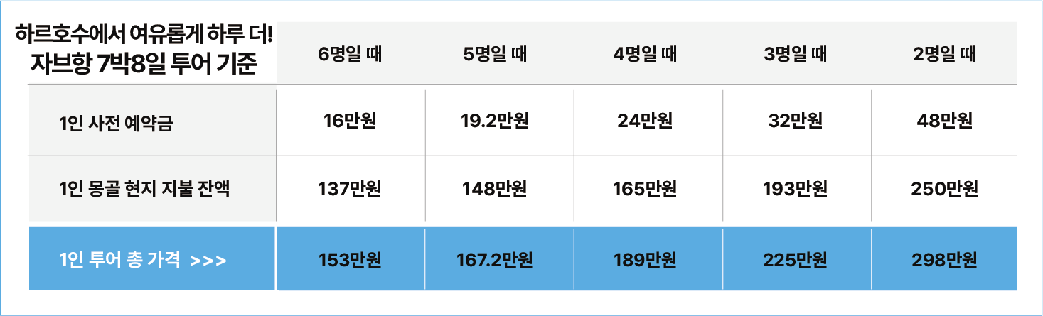 - 예약금을 제외한 잔액은 몽골에 도착한 후 자야트래블에게 투어 시작 전 한화로 지불하면 됩니다.(달러도 물론 가능!)