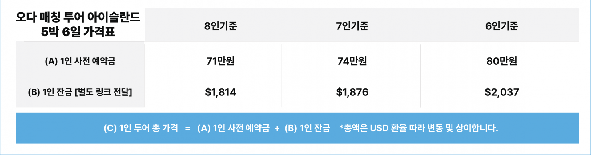 - 예약금을 제외한 잔액은 아이슬란드 투어 시작 2주 전 상담채널을 통해 결제 링크가 발송 됩니다. 해당 링크를 통해 USD 기준으로 지불 하시면 됩니다.