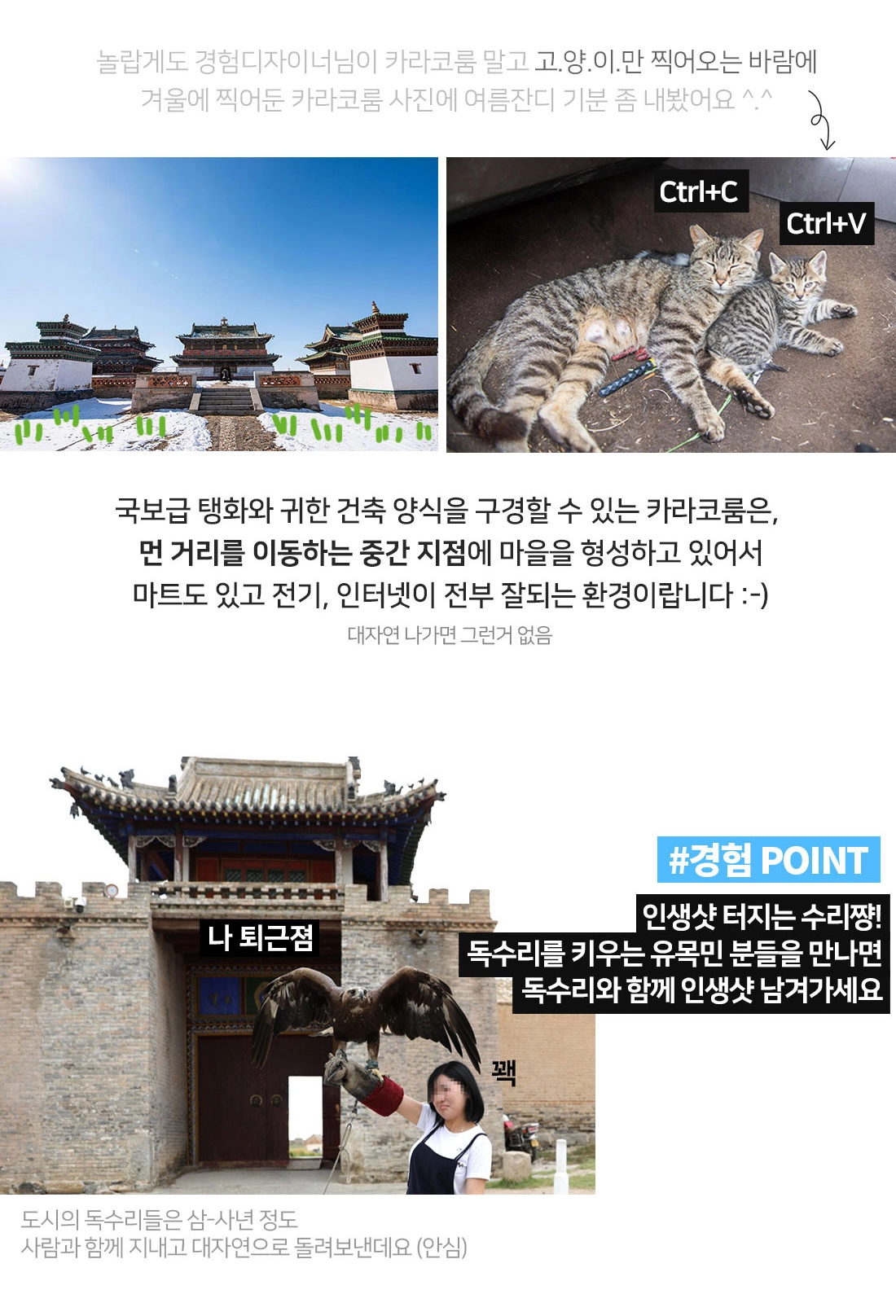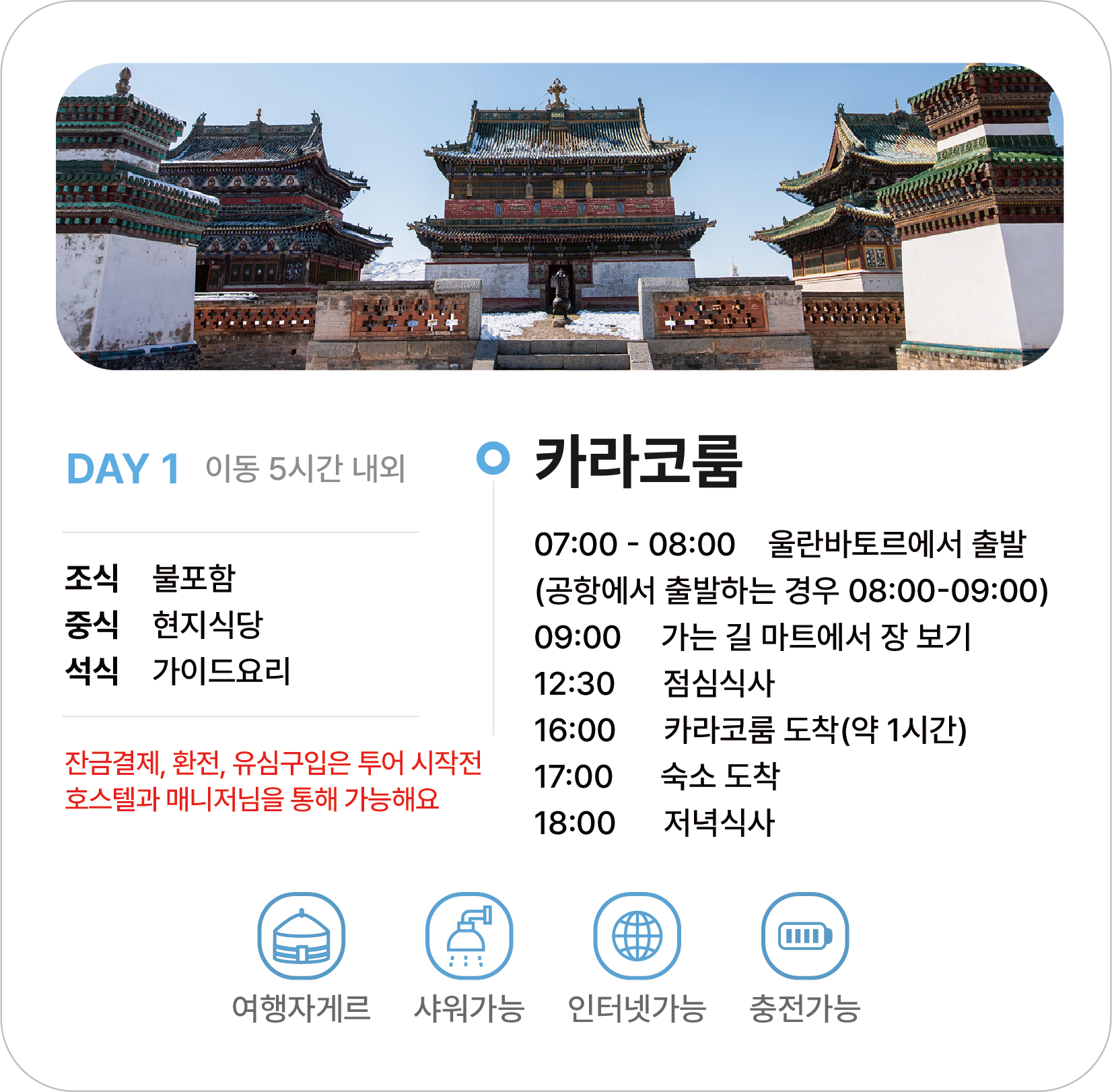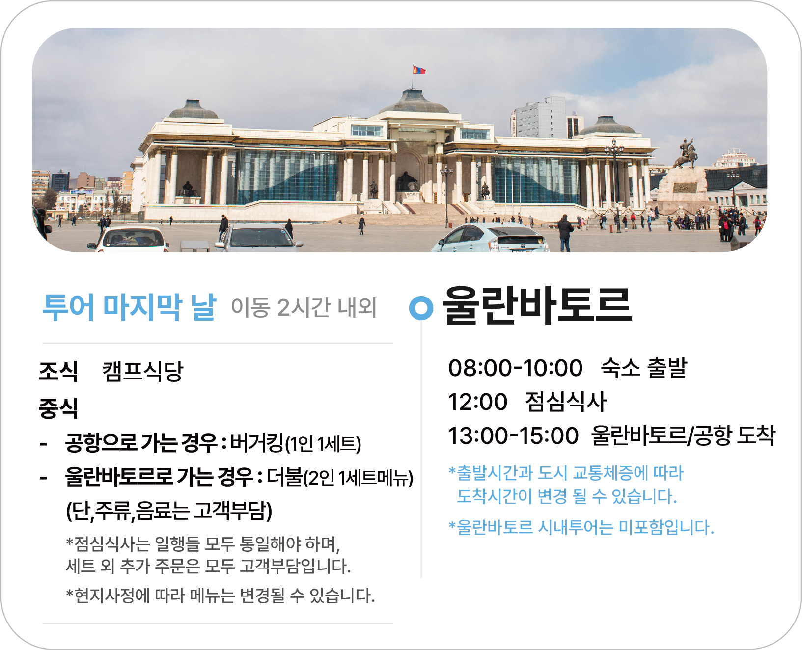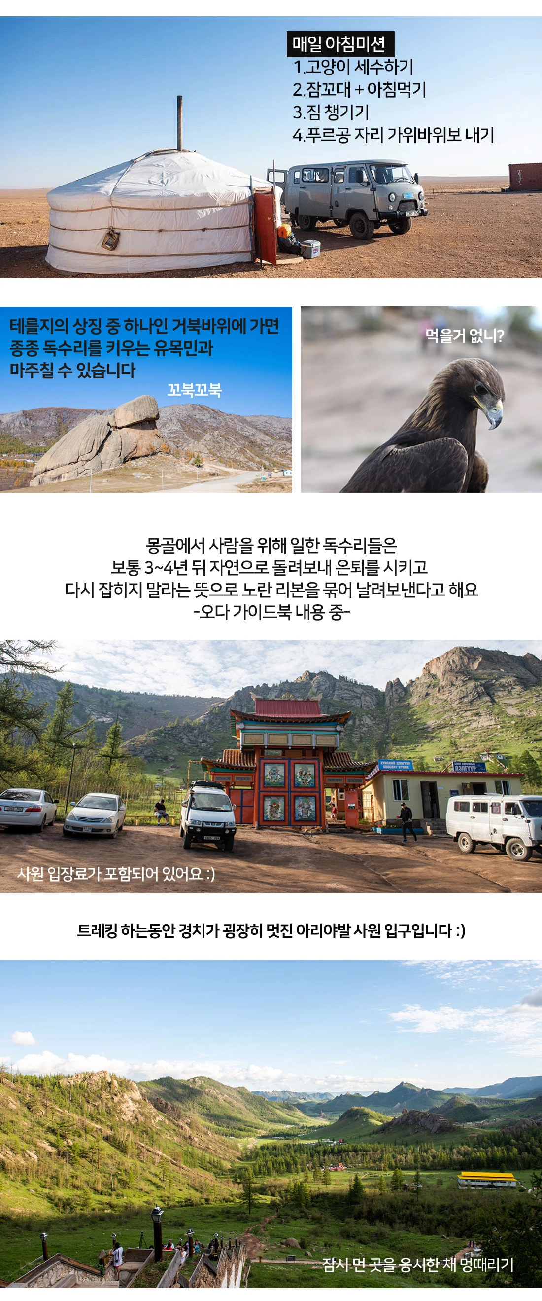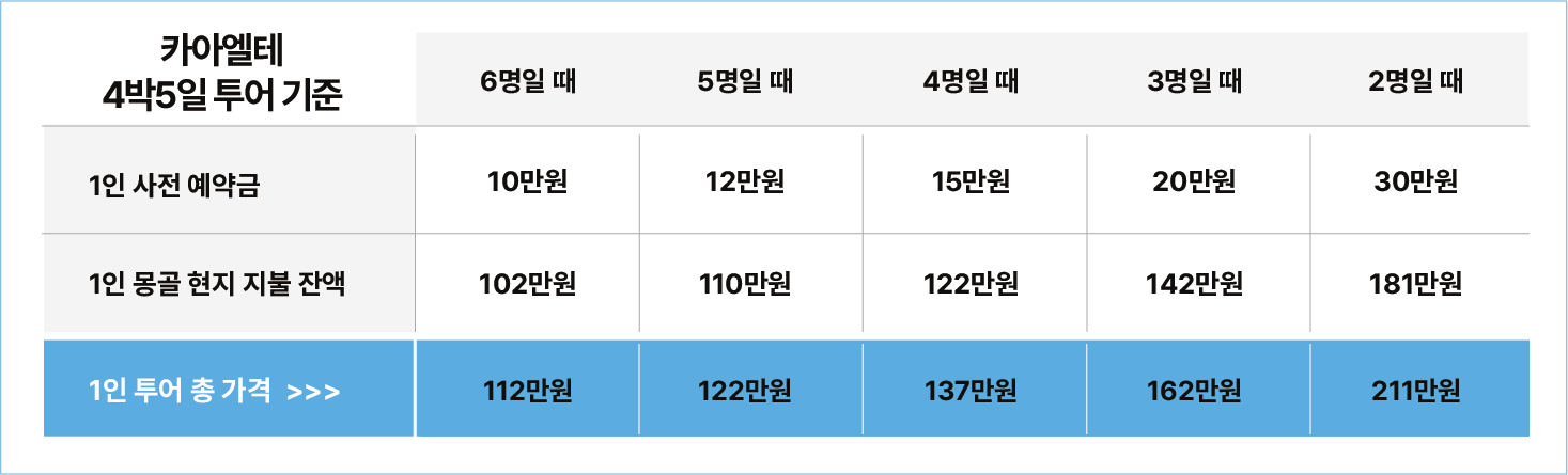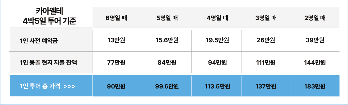 - 예약금을 제외한 잔액은 몽골에 도착한 후 자야트래블에게 투어 시작 전 한화로 지불하면 됩니다.(달러도 물론 가능!)