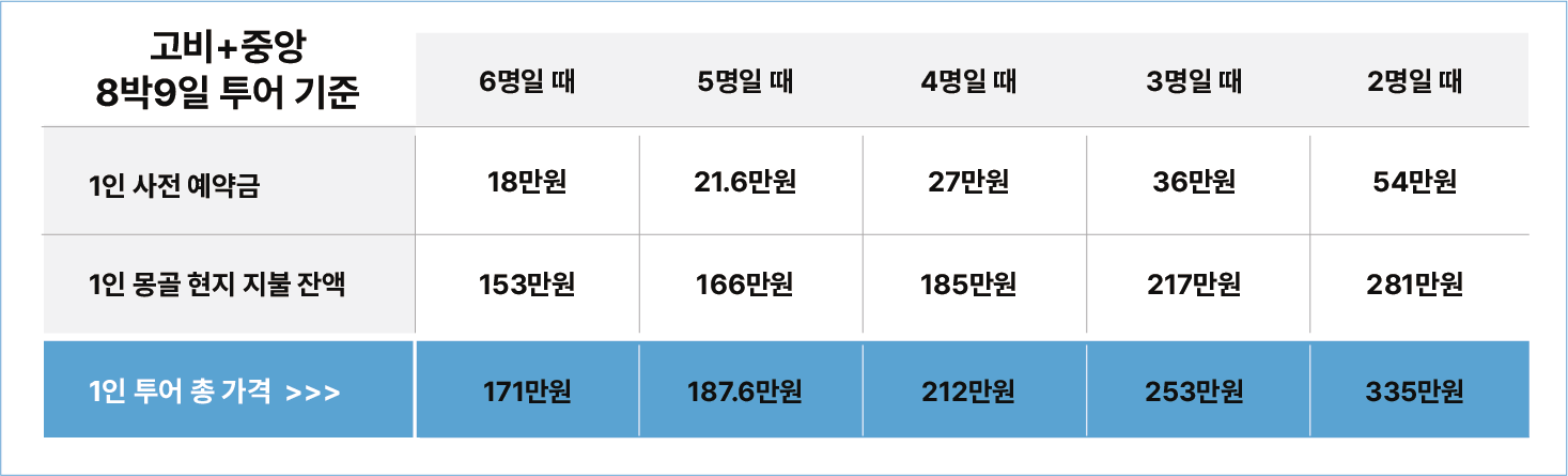 - 예약금을 제외한 잔액은 몽골에 도착한 후 자야트래블에게 투어 시작 전 한화로 지불하면 됩니다.(달러도 물론 가능!)