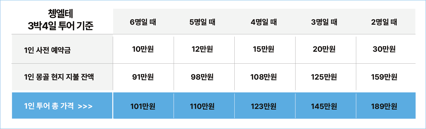 - 예약금을 제외한 잔액은 몽골에 도착한 후 자야트래블에게 투어 시작 전 한화로 지불하면 됩니다.(달러도 물론 가능!)